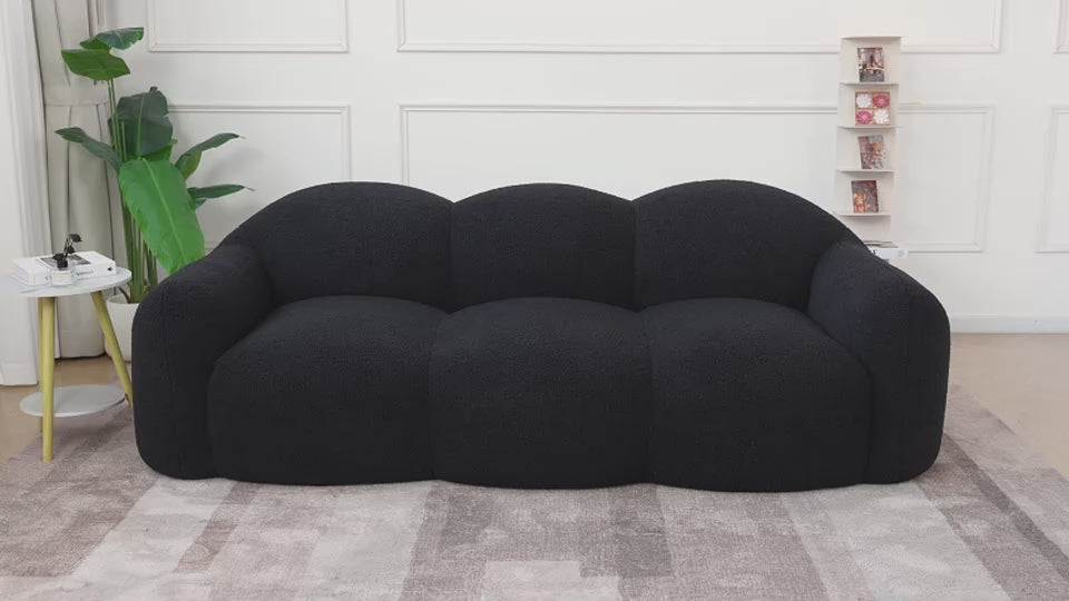 The Calyra is a modern three-seater cloud-style boneless sofa designed for relaxed living and everyday comfort. Vacuum-compressed for easy delivery, this three-seater expands into a plush, supportive seating experience without the need for a rigid frame. Its soft teddy boucle fabric and sponge-filled interior create a cozy, sink-in feel while maintaining shape for daily use.